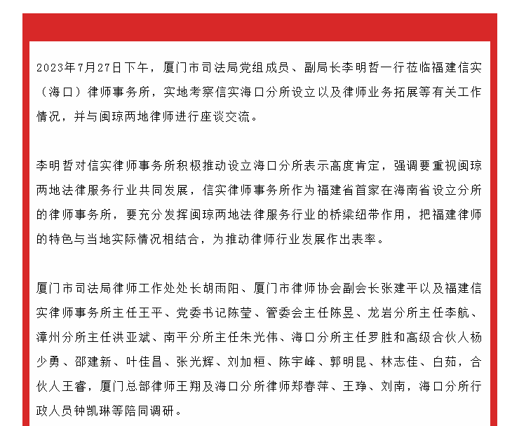 厦门市司法局李明哲副局长前往信实律师事务所海口分所考察调研