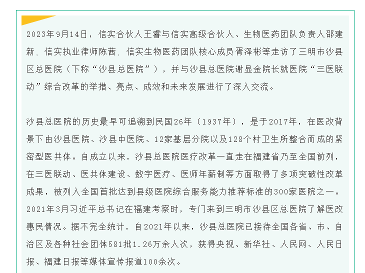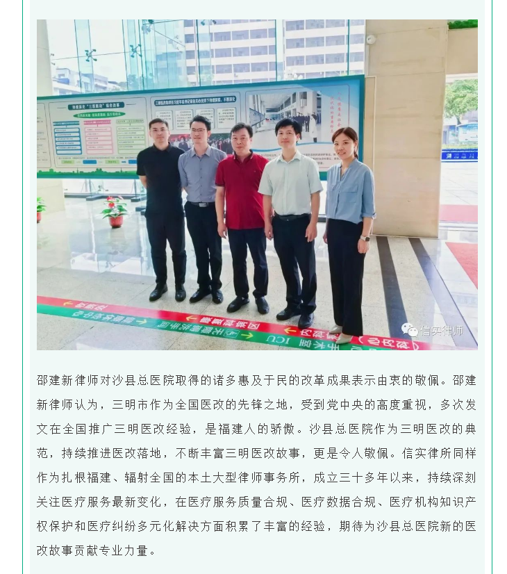 信实律师前往三明市沙县区总医院进行走访交流,双方就常年法律顾问服务相关事宜达成共识