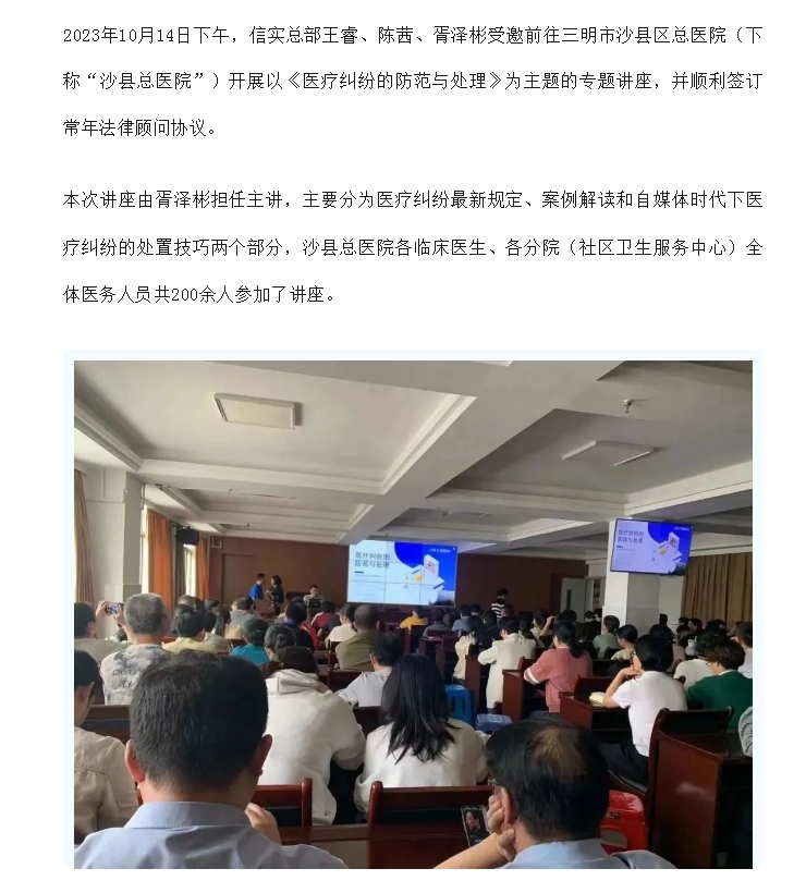 信实律师受邀为三明市沙县区总医院开展医疗纠纷防范与处置专题讲座并签订常年法律顾问协议