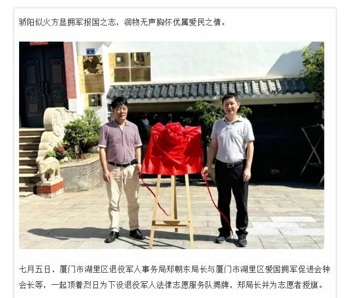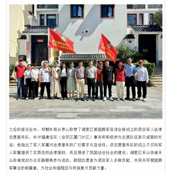 厦门市湖里区爱国拥军促进会下设退役军人法律服务站揭牌,信实律师为退役军人提供志愿法律服务