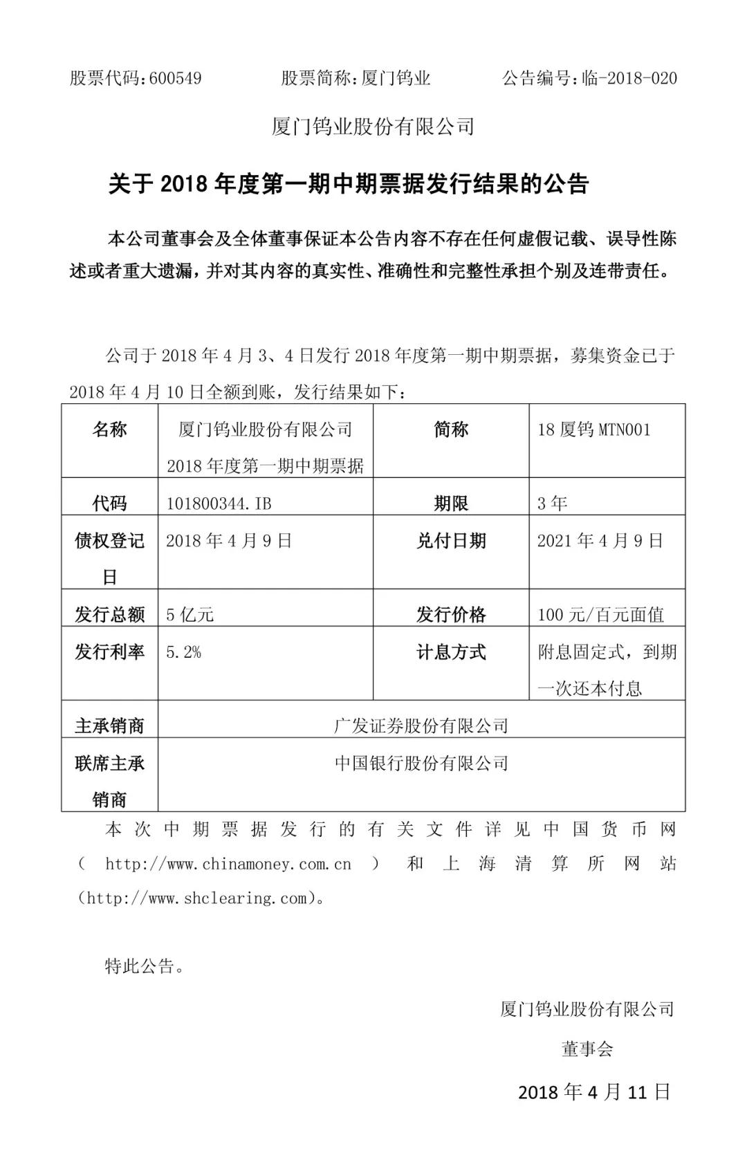 2018年4月4日,厦门钨业股份有限公司(以下简称“厦门钨业”,证券代码:600549)在中国银行间债券市场成功发行2018年度第一期中期票据,本期发行总额为人民币5亿元,发行利率为5.2%。