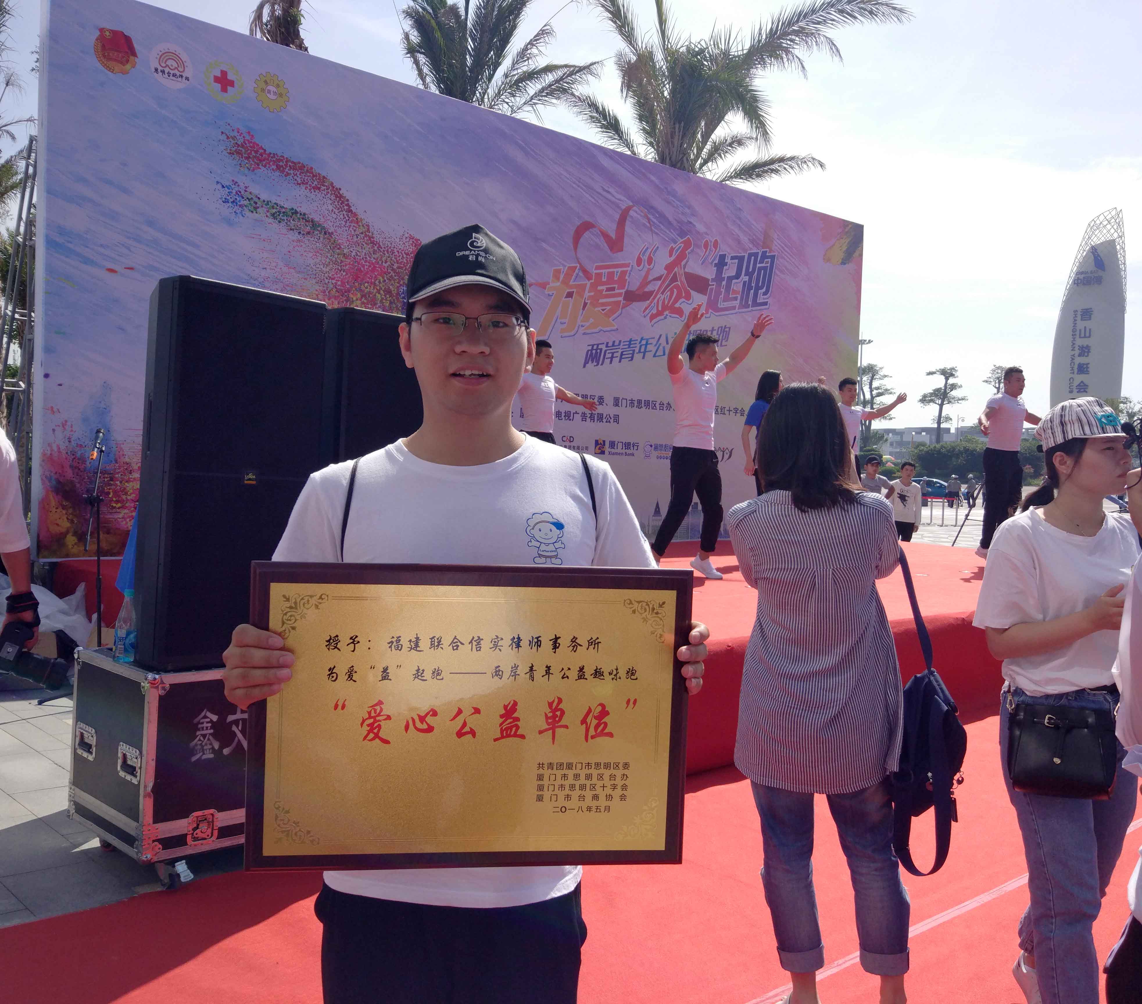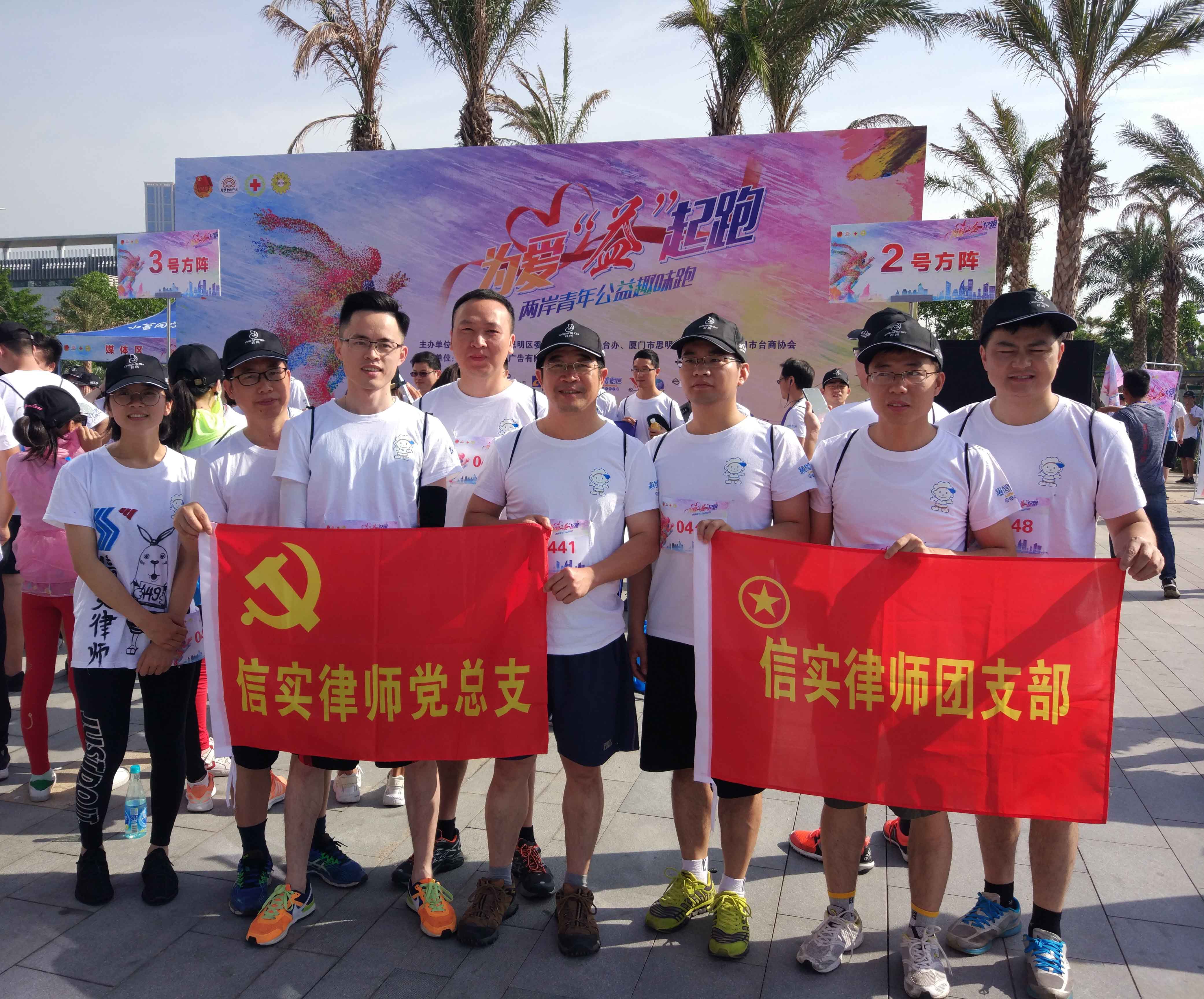 为纪念“五四”运动99周年和改革开放40周年,增进两岸青年交流,2018年5月5日上午,由共青团厦门市思明区委、厦门市思明区台办、厦门市思明区红十字会、厦门市台商投资协会共同主办,厦门广播电视广告有限公司承办的“为爱益起跑”两岸青年公益趣味跑活动,在厦门思明区环岛路拉开序幕。福建联合信实律师事务所(“信实”)响应号召,信实党总支、团支部积极组织和选派的两支队伍共计10名律师在选拔中脱颖而出,参加本次公益跑活动。