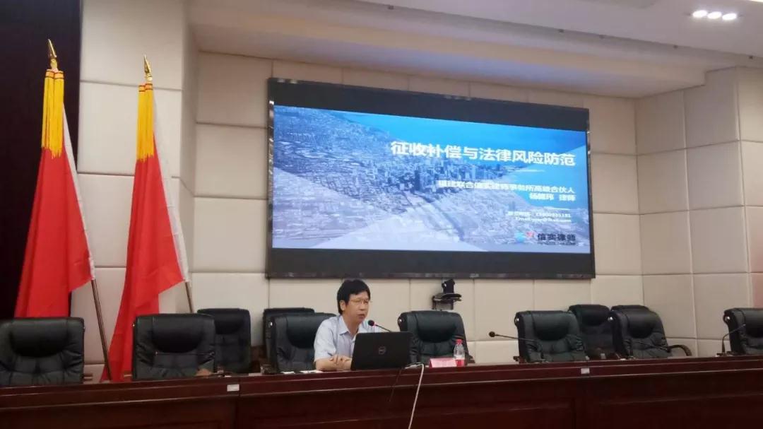 在全面推进依法治国的新时代,依法行政是贯彻“依法治国”、建设“法治政府”的重要实践。为此,湖里区司法局根据关于依法行政的相关文件精神,定期开展依法行政法制培训。信实杨朝玮律师凭借其在征收补偿领域丰富的执业经验接受此次授课邀请,以“征收补偿与法律风险防范”为主题讲解了征收补偿涉及的法律法规以及征收补偿实务中的法律风险,其中结合司法部门的工作特点,着重讲解了征收补偿实施中的法律风险,以指导司法工作人员依法合规、严谨细致地作出征收补偿行为。