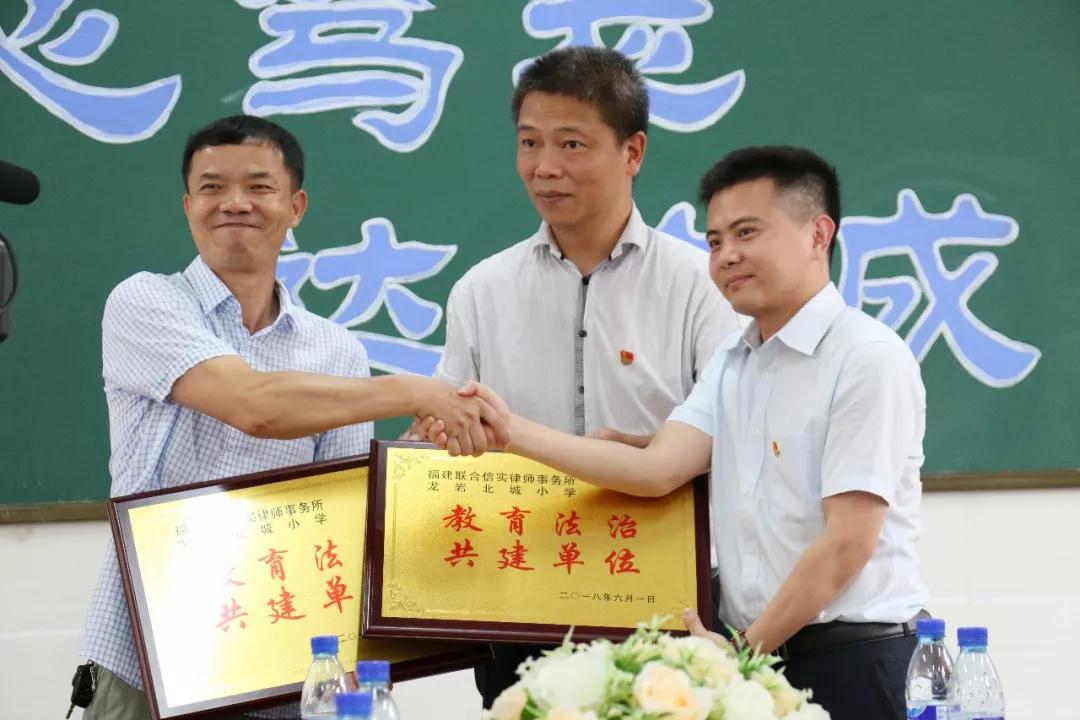 捐书仪式后迎来了本次活动的第三个环节——共建单位授牌仪式。在授牌之前,龙岩北城小学邱校长为我们详细介绍了学校及在校学生的情况。龙岩北城小学自2016年8月开始招生办学,已将招生对象清晰界定为外来务工人员的随迁子女,并致力于为这些拥有较少城市资源的孩子们带来良好的教育。兰子禄律师对于校方的举措与规划表达了赞赏之意,同时就信实在共建后如何加强与校方的联动,共同助力学生的教育充分阐释了自己的见解。深入交谈后,双方达成了共建的共识,并举行了授牌仪式。