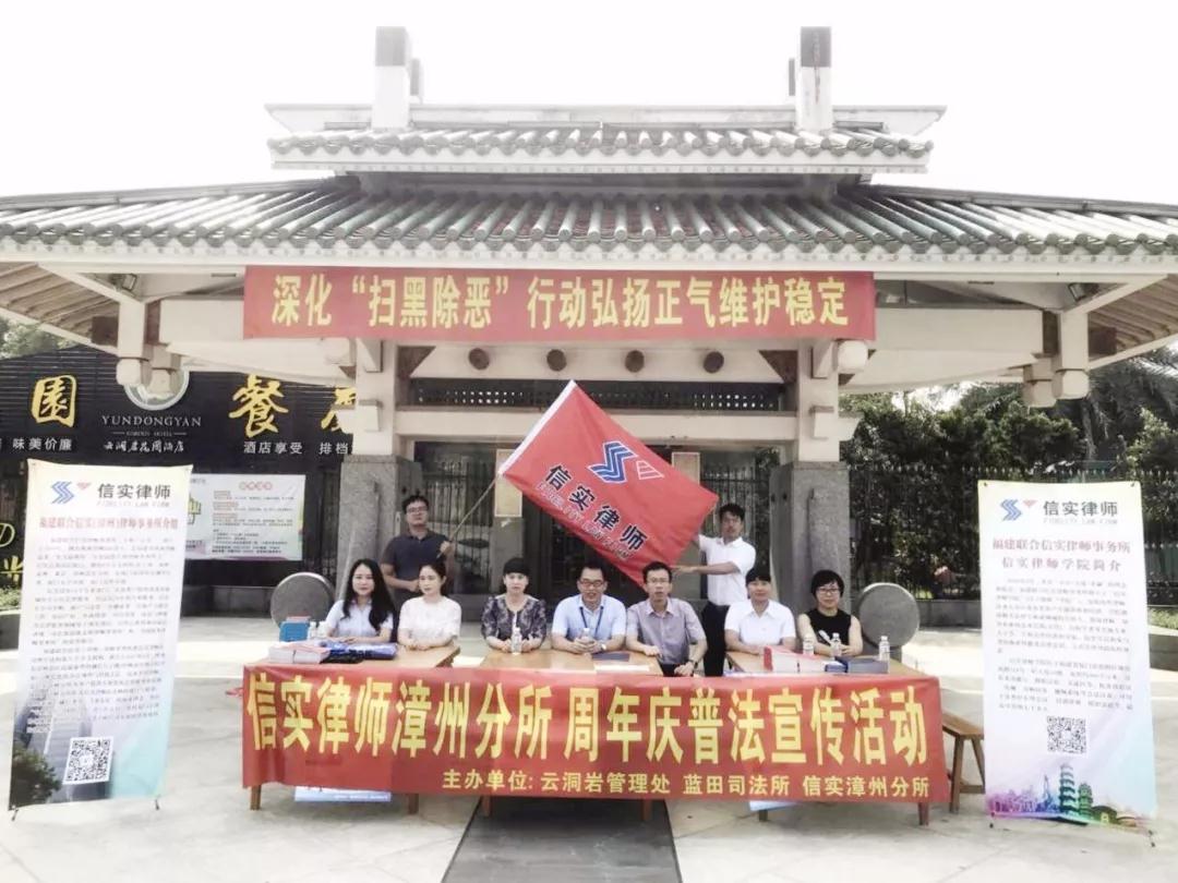 2018年8月18日,信实漳州分所庆祝成立一周年之际,同时积极承担社会责任。在龙文区司法局、云洞岩管理处大力支持下,前往龙文区云洞岩风景区设点进行普法宣传、开展免费法律咨询活动,向游客宣传《宪法》修正案、“扫黑除恶”专项斗争、婚姻家事与劳动法等法律知识,并赠送《宪法》手册、《扫黑除恶专项斗争应知应会》小手册、纪念笔、纪念本以及纪念袋。