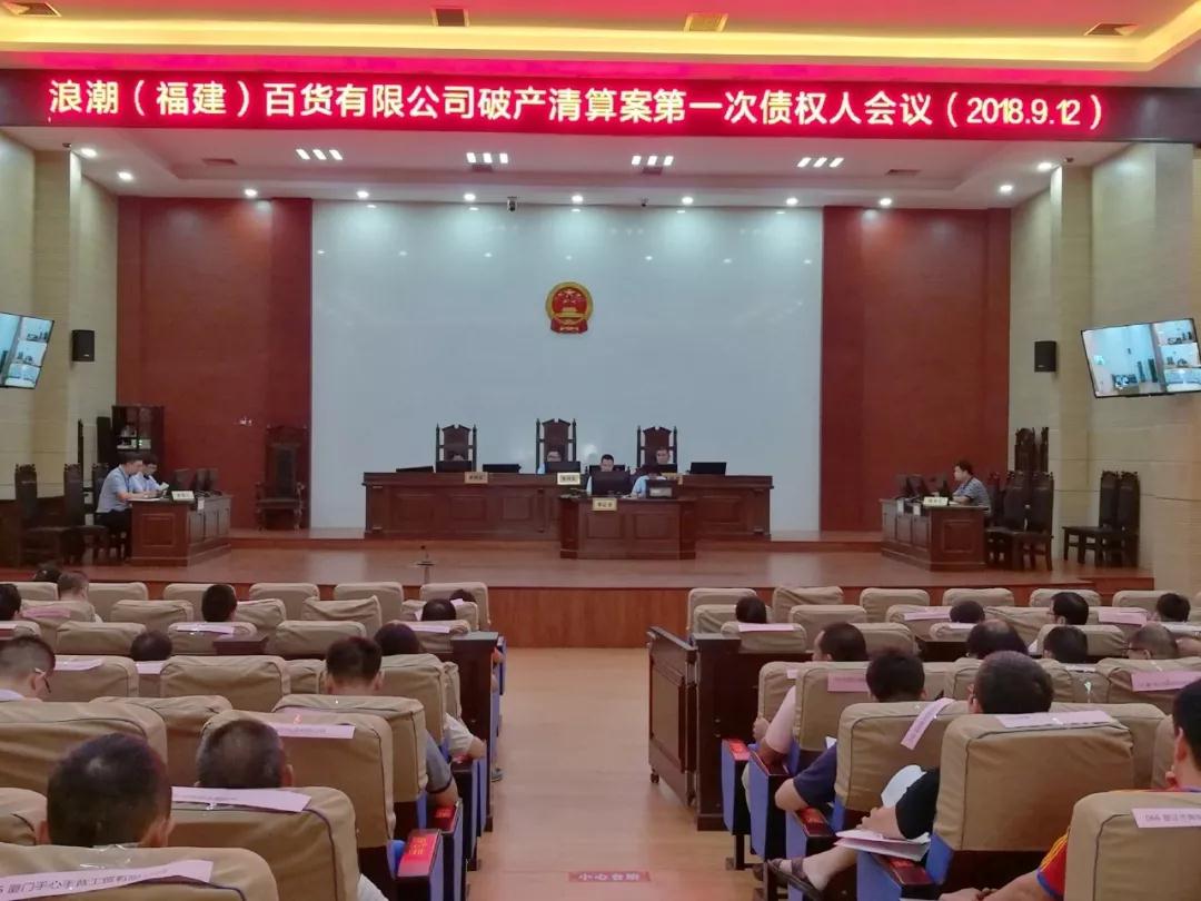 2018年9月12日,浪潮(福建)百货有限公司破产清算案第一次债权人会议在晋江市人民法院第一审判法庭圆满召开。本次会议到会债权人共72家,占总债权人数的比例为78.26%,到会债权人代表的债权金额共213326414.90元,占总债权金额的比例为83.59% 。