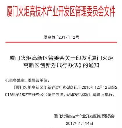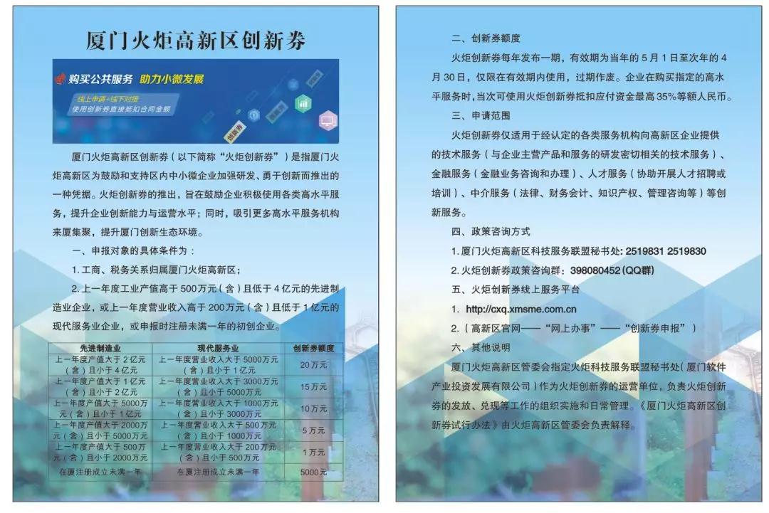 厦门火炬高新区创新券(简称“火炬创新券”)是指厦门火炬高新区为鼓励和支持区内中小微企业加强研发、勇于创新而推出的一种凭据。火炬创新券的推出,旨在鼓励企业积极使用各类高水平服务,提升企业创新能力与运营水平;同时,吸引更多高水平服务机构来厦集聚,提升厦门创新生态环境。