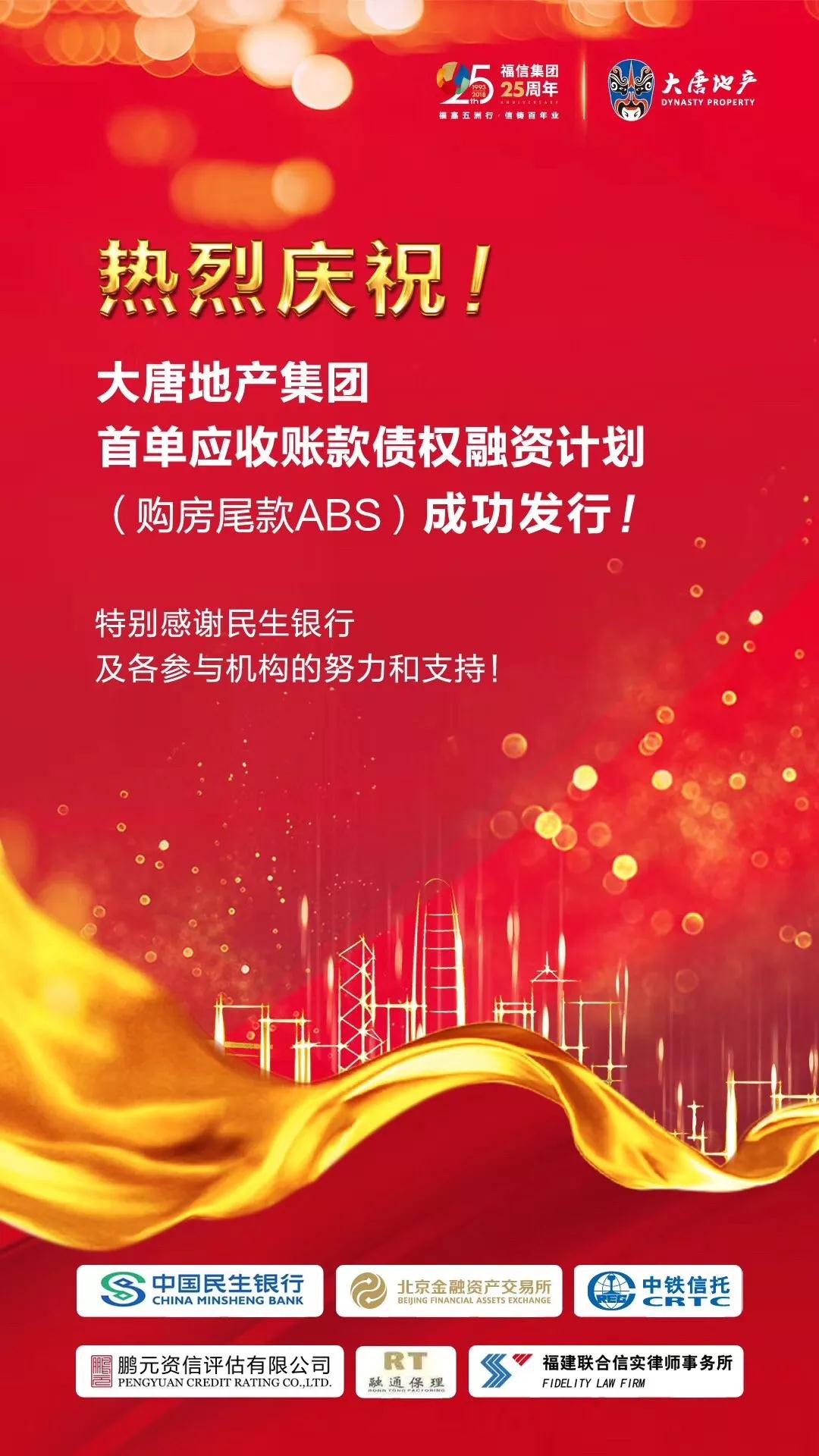 本次融资计划历时半年,凝聚多方的努力和合作:中国民生银行担任主承销商;深圳市前海融通商业保理有限公司自厦门大唐房地产集团有限公司处受让应收账款债权,将其委托予中铁信托有限责任公司设立“中铁信托-大唐福信2018年度第一期财产权信托”;鹏元资信评估有限公司提供信用评级服务;以该信托为发行载体,在北京金融资产交易所备案挂牌“汇富-大唐福信2018年度第一期应收账款债权融资计划”。