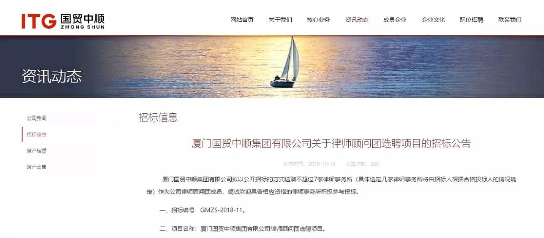 2018年10月中旬,厦门国贸中顺集团有限公司(简称“国贸中顺”)以公开招标的方式选聘律师顾问团成员。福建联合信实律师事务所(简称“信实”)积极响应,指派高级合伙人陈昱、张琳、邱兴亮、张光辉以及章龙、邱玲玲律师组成律师服务团队,参与此次项目投标。
