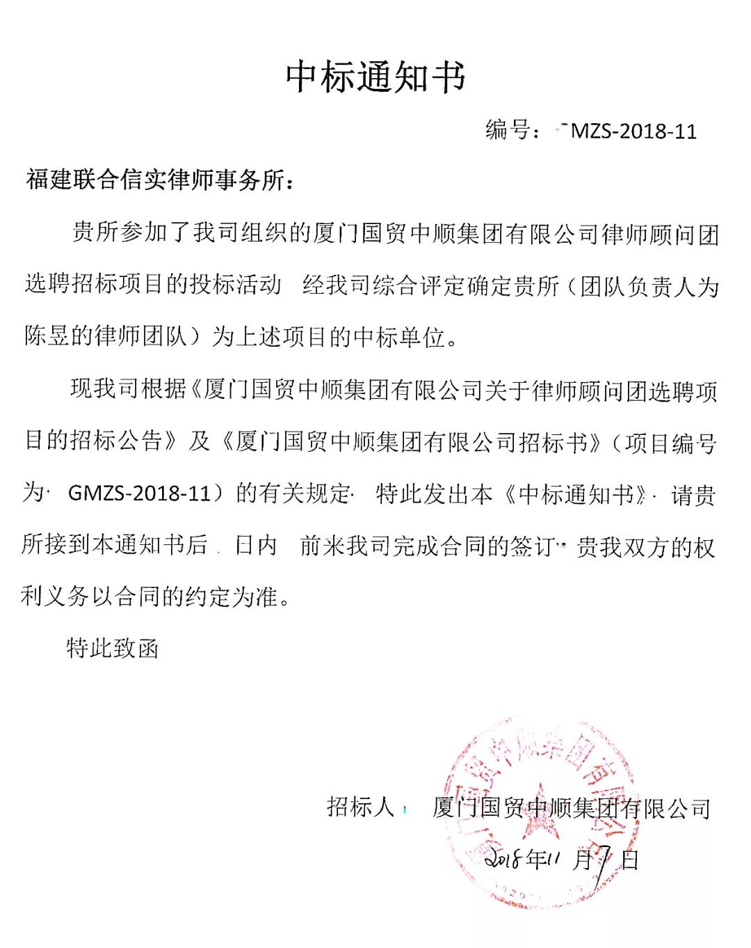 2018年11月7日,国贸中顺向信实发送了《中标通知书》,信实在多家应标律所中脱颖而出,成功入库国贸中顺律师顾问团。