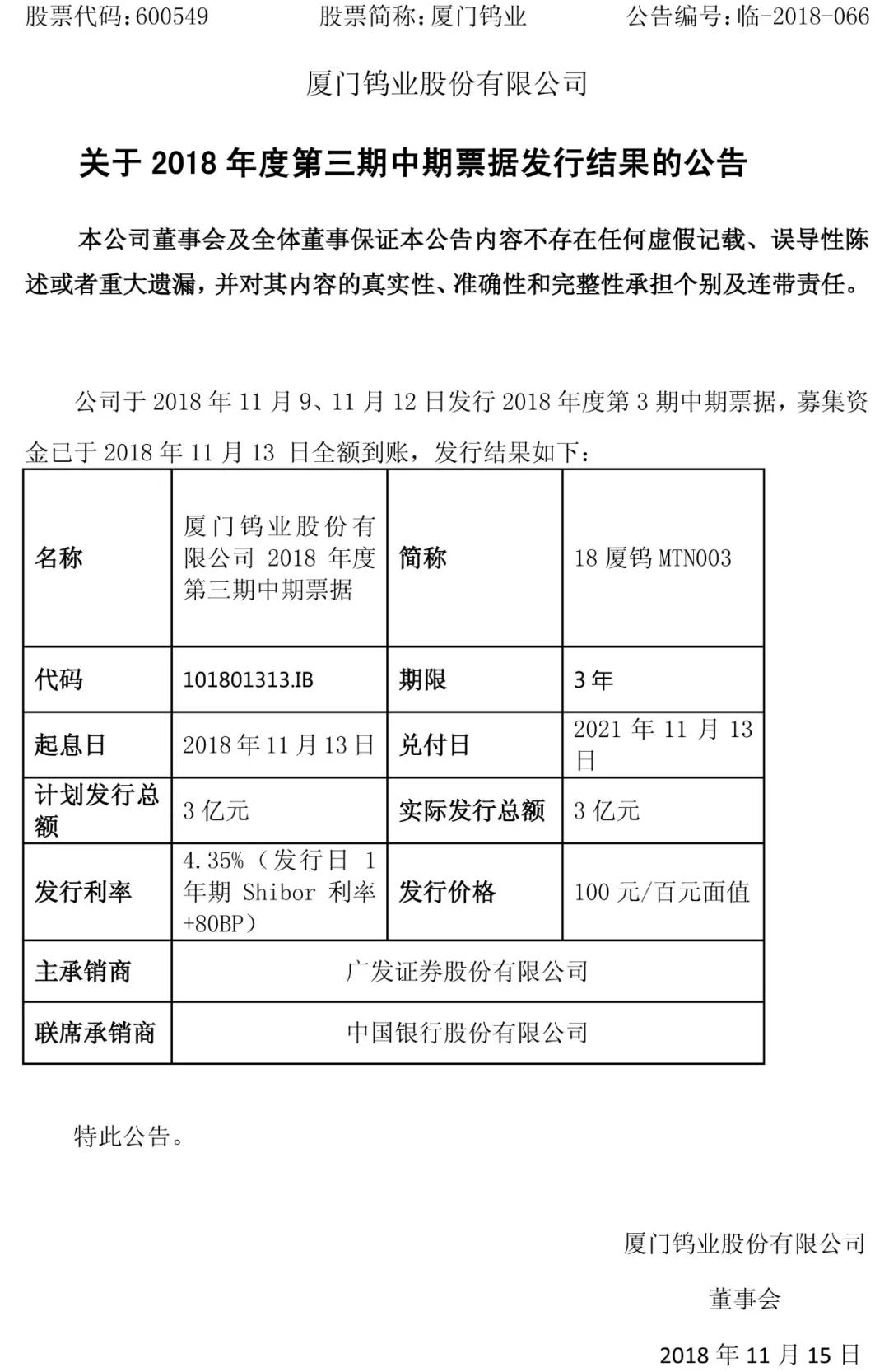 2018年11月13日,福建联合信实律师事务所(下称“信实”)王平、张光辉律师协助承办的厦门钨业股份有限公司(证券代码:600549,下称“厦门钨业”) 2018年度第三期中期票据(18 厦钨 MTN003)在中国银行间债券市场成功发行,本期发行额为人民币3亿元,发行期限3年,发行利率仅为4.35%,创今年同期限、同评级中票最低发行利率,为厦门钨业节省了不少融资成本。