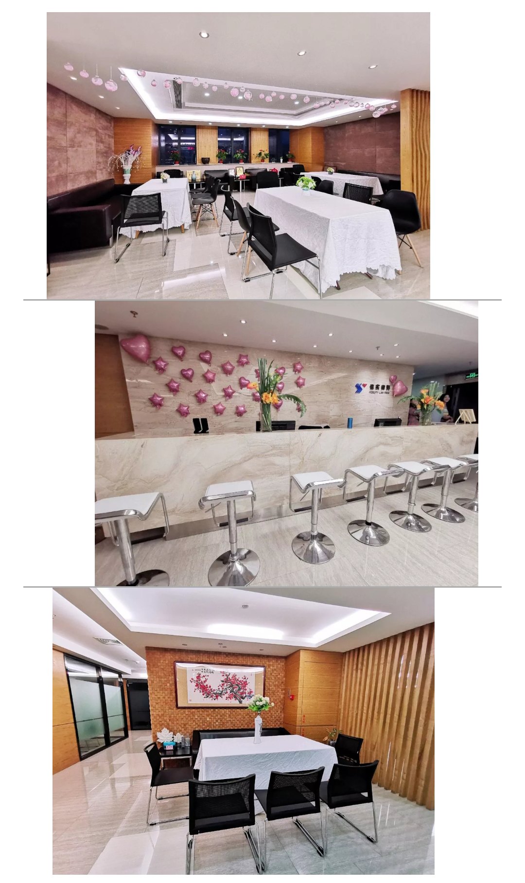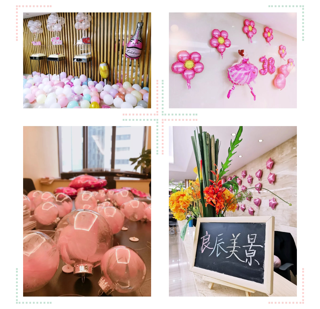 提到粉红色,往往让人联想到“浪漫”、“可爱”、“柔美”等美好的字眼。在这个特殊的日子里,在筹备组成员的精心布置下,信实总部弥漫着各种粉红色元素,气球、气泡灯、异形牌等,一下子使明朗严谨的办公场所变成了温馨活泼的粉红乐园。