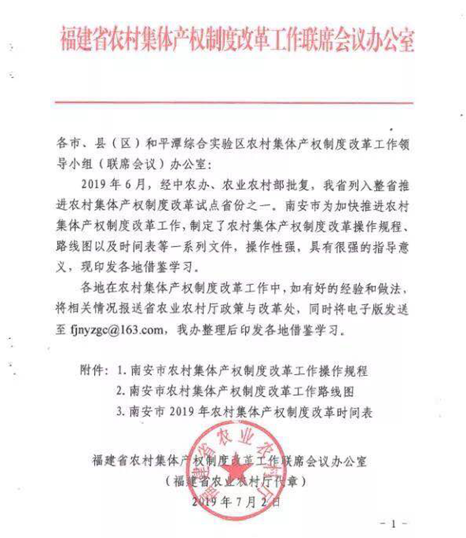 2019年7月2日,由福建联合信实(泉州)律师事务所(简称“信实泉州分所”)律师团队协助南安市农业农村局制定的《南安市农村集体产权制度改革工作操作规程》《南安市农村集体产权制度改革工作路线图》《南安市2019年农村集体产权制度改革时间表》等文件因“操作性强,具有很强的指导意义”,获得福建省农村集体产权制度改革工作联席会议办公室的认可,并统一印发全省各地市借鉴学习。