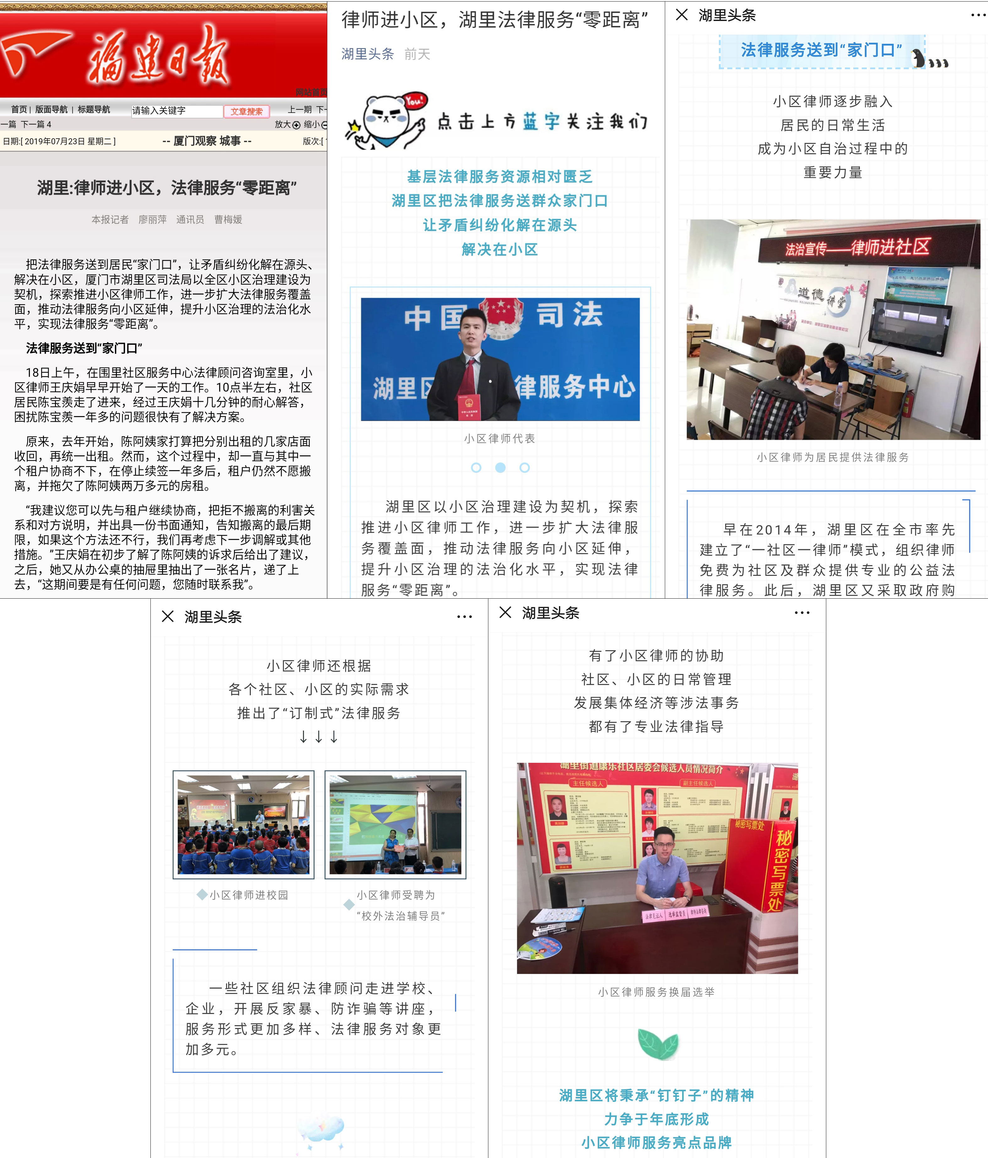 2019年,律师进小区的政策落地生根,选取了15个小区,重点推广六类特色小区律师法律服务,并计划今年在全区396个小区实现小区律师全覆盖,力争于年底形成“湖里模式”的小区律师服务亮点品牌。