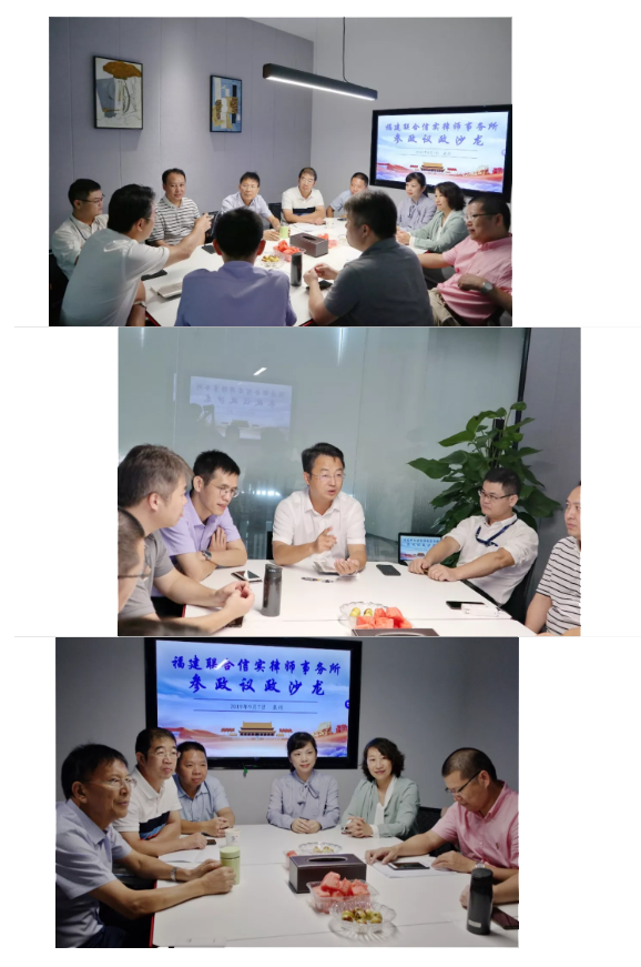 中午,参政议政沙龙如期举行。厦门市人大代表庄华力、福州分所律师杨虹、民主党派成员张光辉、李文长、张进玉、邱兴亮(厦门市政协委员)、兰子禄(龙岩市政协委员)、陈军升、陈昱(厦门市湖里区人民代表)、叶佳昌,就立足律师本职工作,发挥专业优势,凝心聚力,集思广益,建有用之言,献务实之策,提升参政议政成效,协助推进立法工作等方面展开热烈的讨论。律所党总支书记陈莹出席指导。