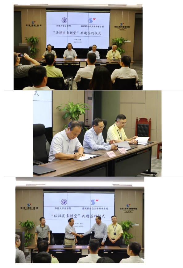 下午五时许,信实与华侨大学法学院“法律实务讲堂”共建签约仪式在泉州分所大会议室举行。华侨大学法学院党委书记曾佳扬、许少波院长出席了签约仪式。本次基地共建的落地实施,可以充分发挥华侨大学法学院的理论研究优势和信实在法律服务市场的三十年实践经验,相互学习、相互促进、共同发展。