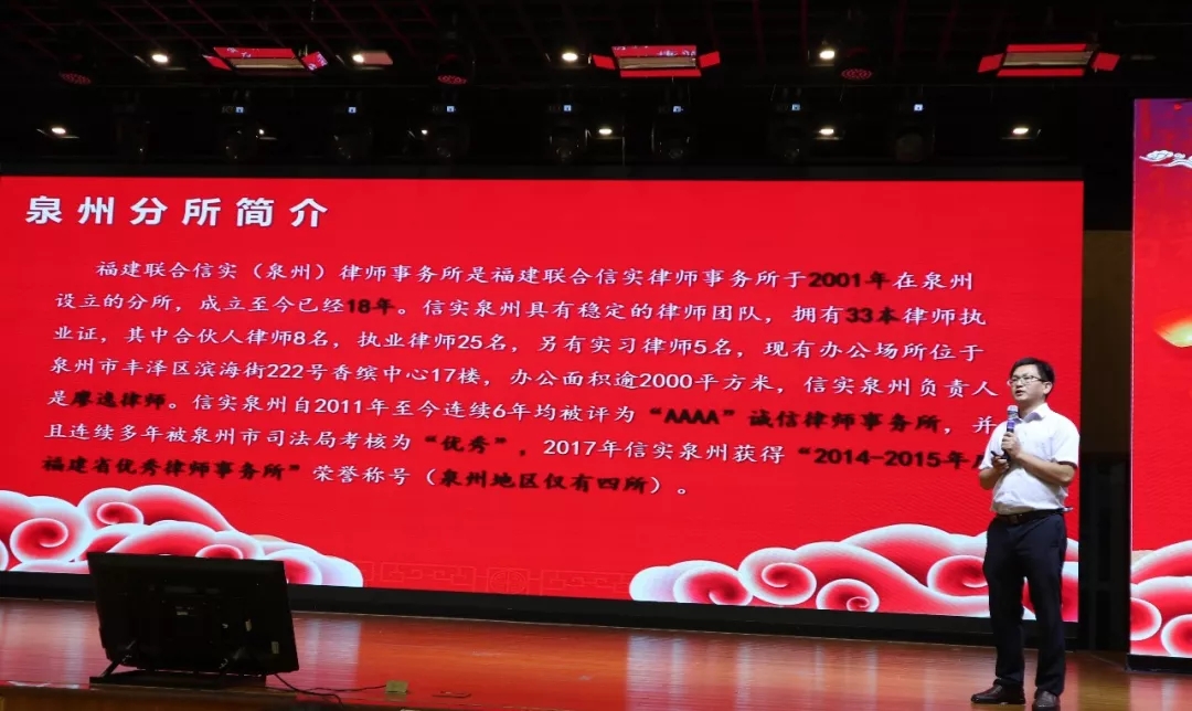 信实泉州分所成立于2001年,至今成立18年,是信实在厦门之外设立的第一家分所。信实泉州分所高级合伙人潘帝全律师带领全体信实人回顾了信实泉州分所成立以来的18年发展历程及获得的各项荣誉。