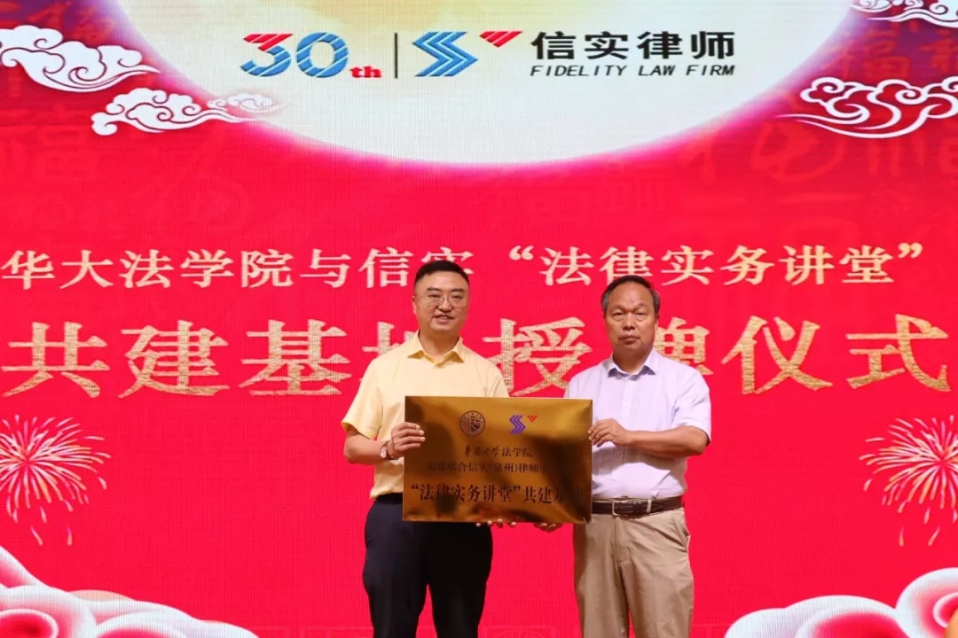 华大法学院与信实“法律实务讲堂”基地达成共建协议,并由华侨大学法学院许少波院长和信实泉州分所主任廖逸律师共同完成此次授牌仪式。