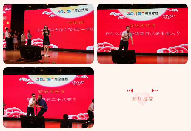 晚会中间穿插有趣的小游戏——每桌博饼状元代表上台,分成两组,猜谜语、对诗词、脑筋急转弯,全场笑声不断、不亦乐乎。