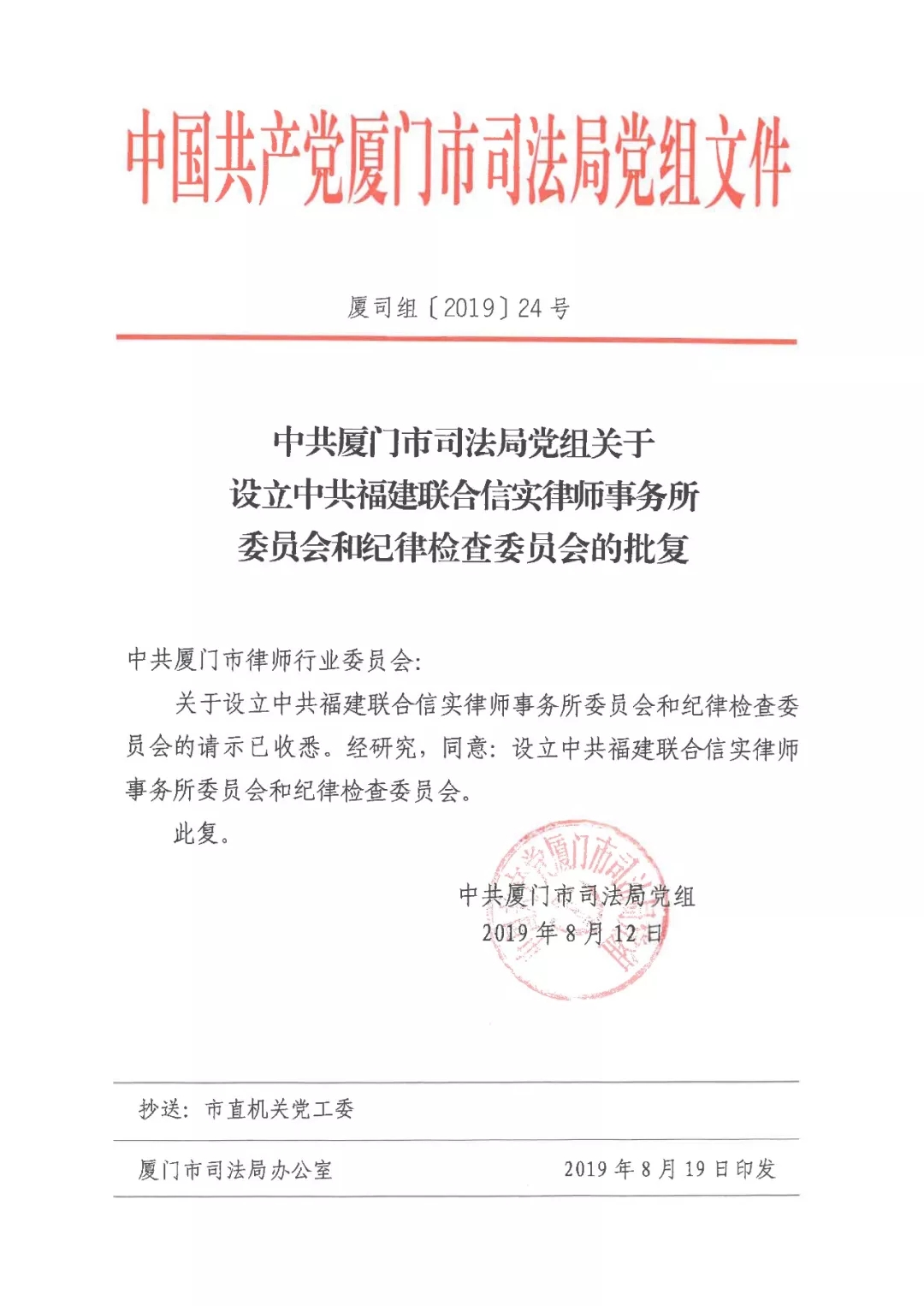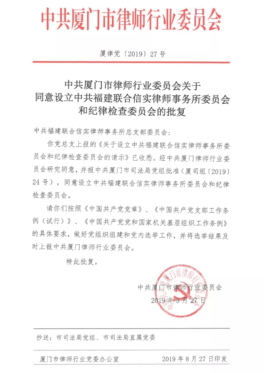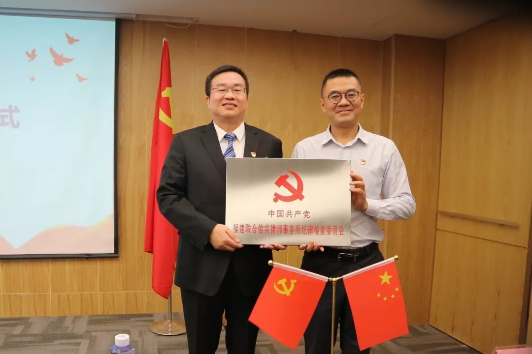 中共厦门律师行业纪委书记赖敬佩同志为中共福建联合信实律师事务所纪律检查委员会授牌,委员代表吕平同志接受授牌