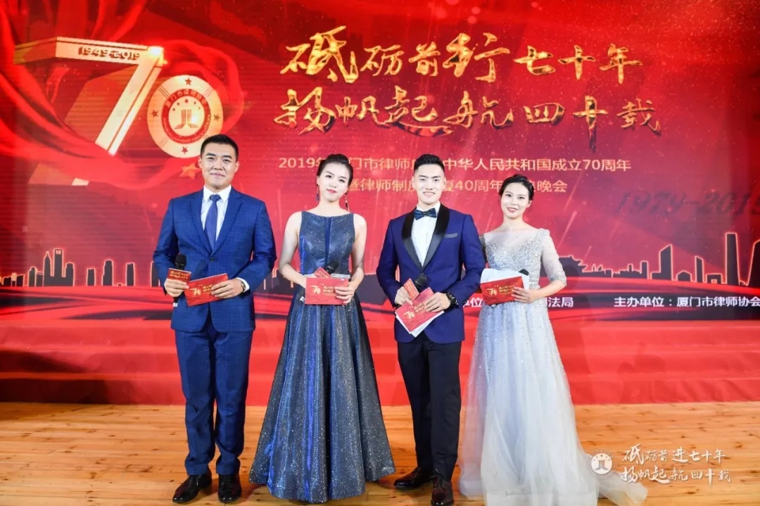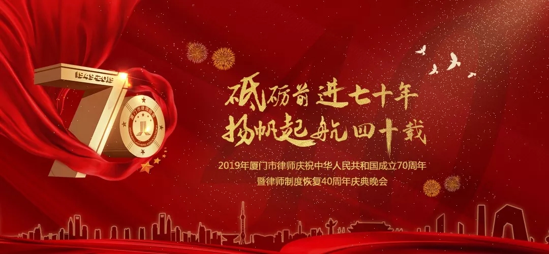 2019年10月29日,由厦门市律师协会主办,厦门市司法局指导的“砥砺前行七十年,扬帆起航四十载”庆祝建国70周年暨律师制度恢复40周年庆典晚会在厦门大学科学艺术中心隆重举行。晚会以观看厦门律师发展40周年纪录宣传片《律法不负春秋载 肩扛道义慰民心》开篇,展现了厦门律师行业的蓬勃发展,厦门律师爱岗敬业积极承担社会责任,坚持党的领导,不忘初心,继续前行。
