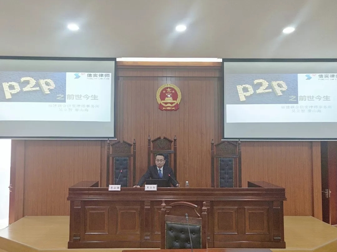 2019年11月21日下午,福建联合信实律师事务所(简称“信实”)金融法律事务部主任、高级合伙人律师廖山海及资深律师吴立智受华侨大学法学院邀请,在华大法学院模拟法庭为2018级本科生讲授了题为“P2P之前世今生”的专题课程。