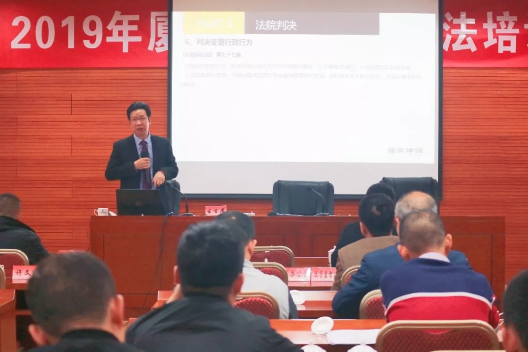 2019年12月5日,应水利系统执法人员培训班的邀请,福建联合信实律师事务所高级合伙人杨朝玮律师,在中共厦门市思明区委员会党校会务中心开展《行政诉讼与依法行政》专题讲座。本次讲座由厦门市水政水保监察支队支队长李琼主持,厦门市水利局庄少生副局长以及市水政水保监察支队和各区水利执法大队的数十名水政水保执法人员到场参加。