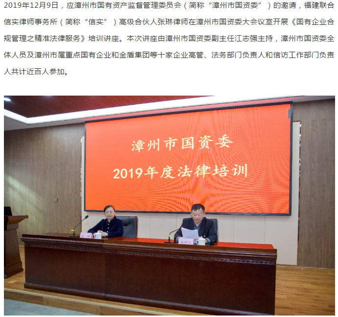 信实高级合伙人张琳律师应邀为漳州市国资委讲授《国有企业合规管理之精准法律服务》|信实动态·信实律师学院