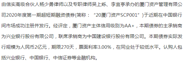 信实助力厦门资产管理有限公司成功发行2020年度第一期超短期融资债券|信实动态·公司证券法律事务部