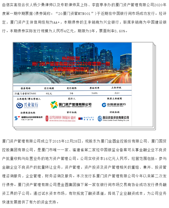 信实助力厦门资产管理有限公司成功发行2020年度第一期中期票据 | 信实动态·公司证券法律事务部