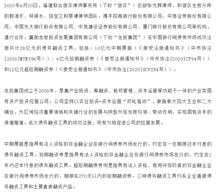 信实助力龙岩投资集团成功注册2020年度债务融资工具 | 信实业绩·公司证券法律事务部