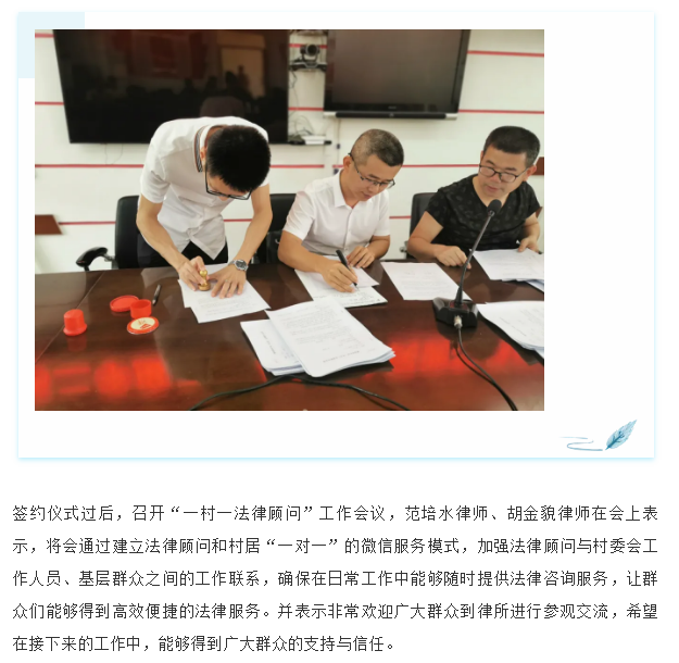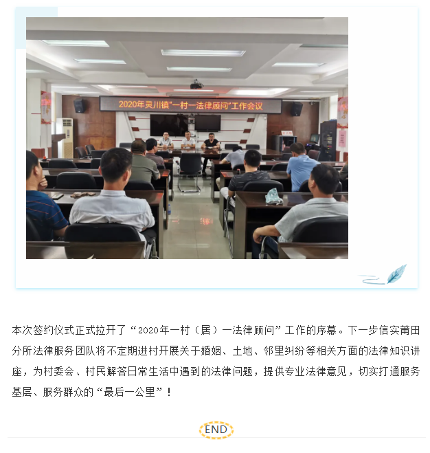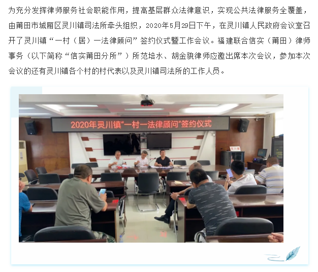 信实范培水、胡金貌律师参加莆田市城厢区灵川镇“一村(居)一法律顾问”签约仪式暨工作会议 | 信实动态·莆田分所