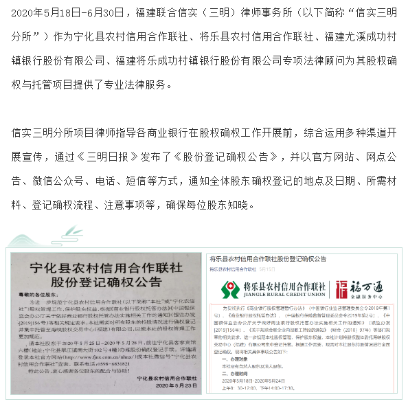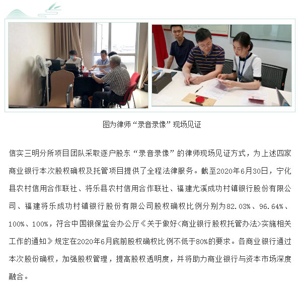 信实律师为多家商业银行股权确权及托管项目提供专项法律服务 | 信实动态·三明分所