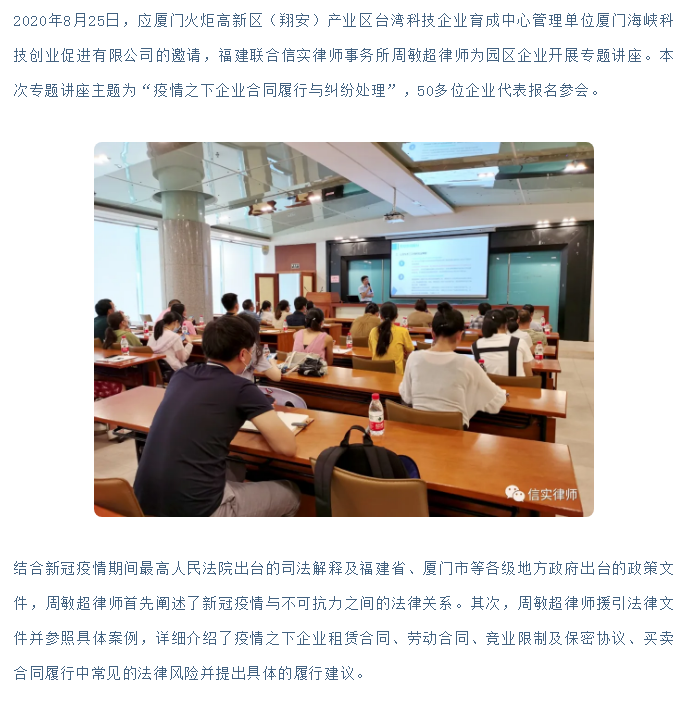 信实周敏超律师应邀为火炬(翔安)育成中心园区企业开展专题讲座|信实动态