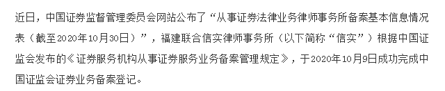 福建联合信实律师事务所完成中国证监会证券业务备案登记|信实动态·公司证券法律事务部