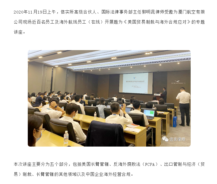 信实所高级合伙人郭明昆律师为厦门航空开展海外经营合规培训|信实动态