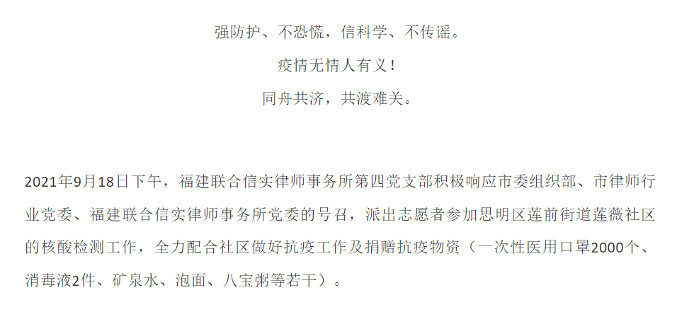 强防护、不恐慌,信科学、不传谣 ——福建联合信实律师事务所第四党支部支援抗疫志愿工作