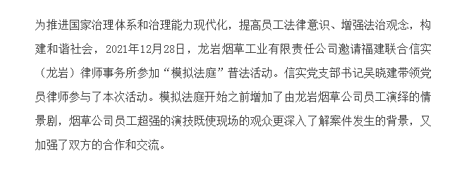 信实龙岩分所“模拟法庭”走进龙岩烟草工业有限责任公司