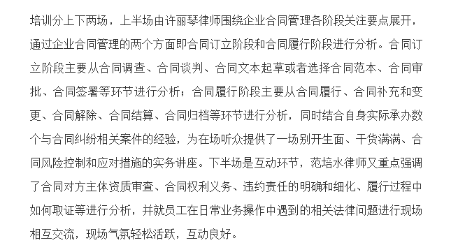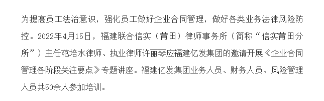 信实莆田分所范培水、许丽琴律师应邀为福建亿发集团开展《企业合同管理各阶段关注要点》专题讲座