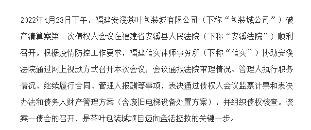 信实律师助力福建安溪茶叶包装城有限公司第一次债权人会议顺利召开