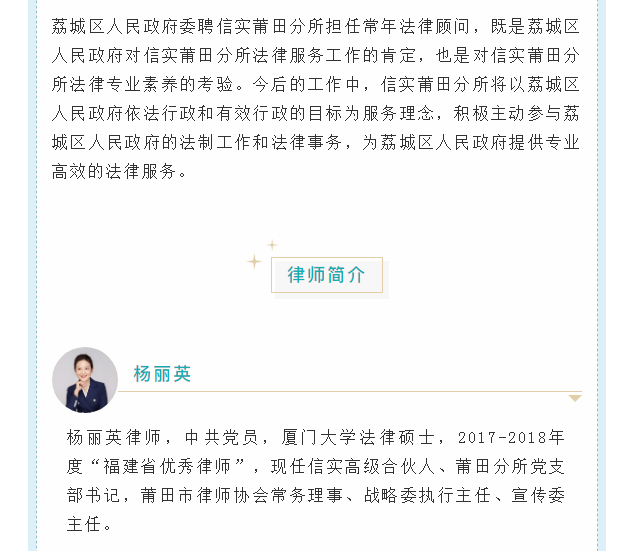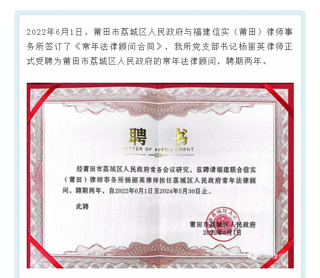 信实莆田分所受聘为莆田市荔城区人民政府法律顾问