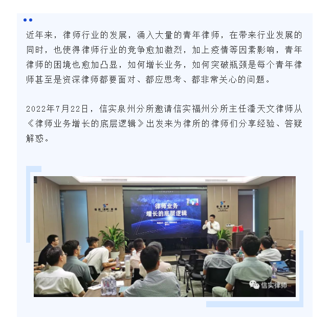 信实泉州分所特邀潘天文主任分享《律师业务增长的底层逻辑》