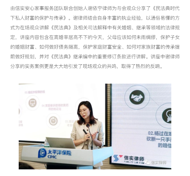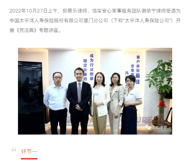 邱蔡乐律师、谢依宁律师受邀为中国太平洋人寿保险股份有限公司厦门分公司开展《民法典》专题讲座