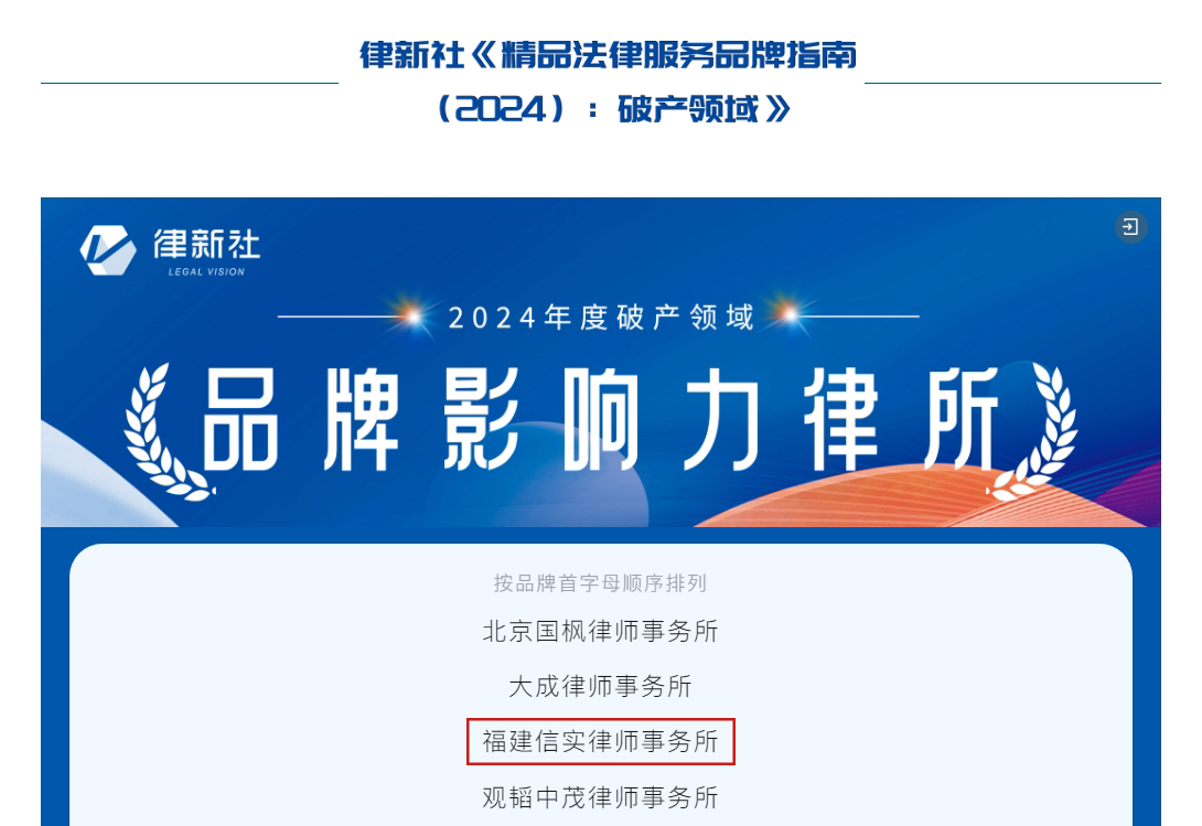 福建信实律师事务所入选《精品法律服务品牌指南(2024):破产领域》律所名录并荣获“律新社2024年度破产领域品牌影响力律所”